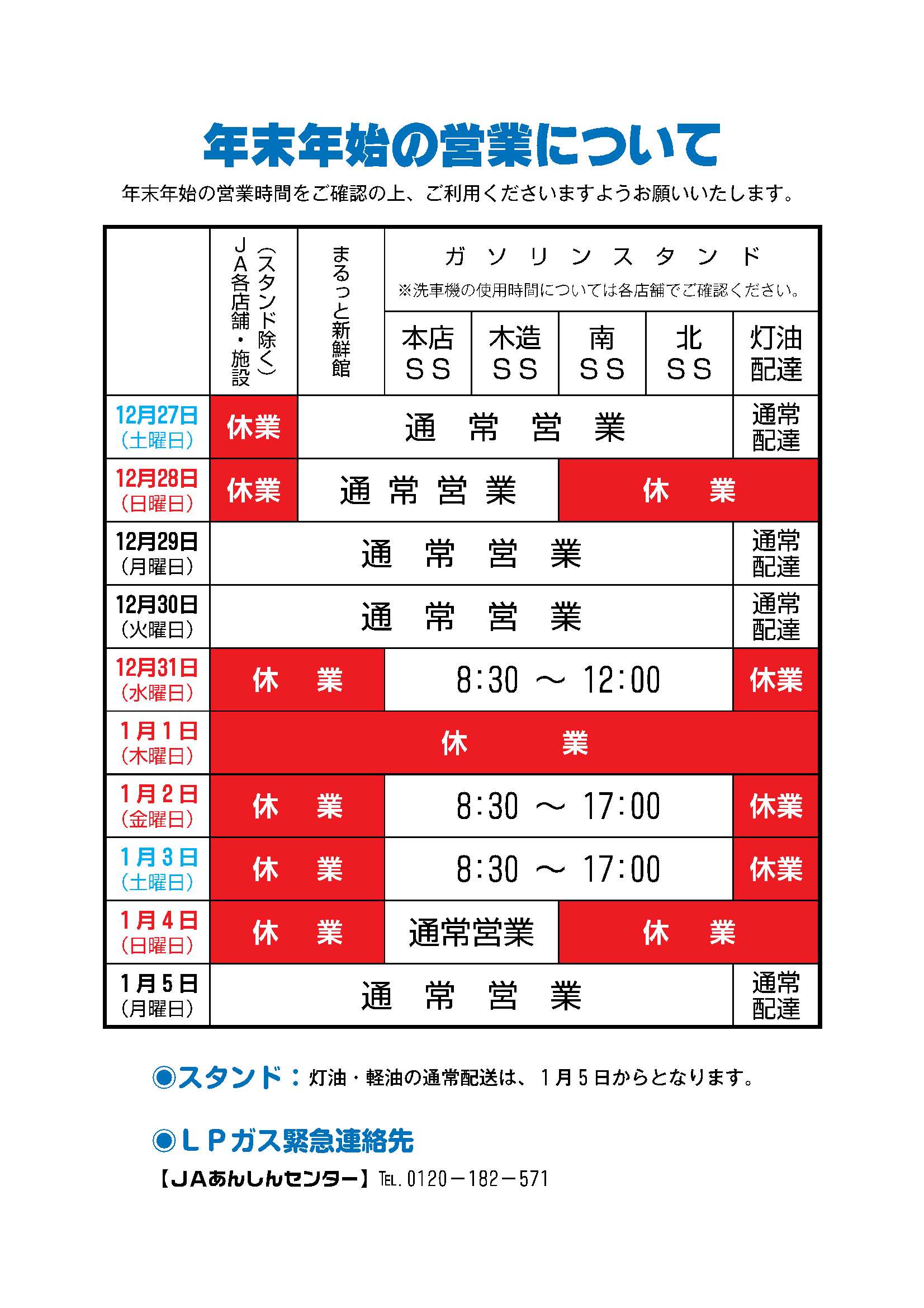 2025.12.21 お知らせ 年末年始の営業について 平素より当JAをご利用いただき、誠にありがとうございます。 年末年始の営業につきましては、施設ごとに営業日・営業時間が異なります。 ご利用の際は、事前に営業日をご確認くださいますようお願いいたします。